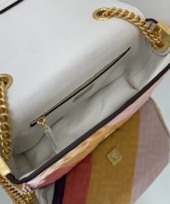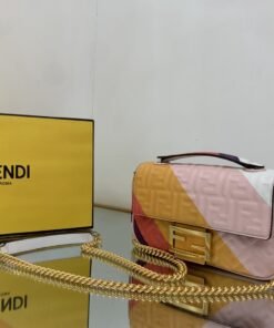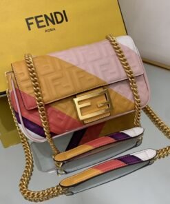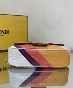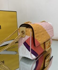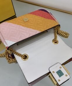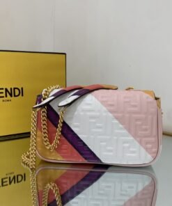 正品级 彩色?FEND? Iconic Baguette中号链条手袋,白色纳帕软皮革材质,饰有3D纹理FF图案。缀以FF搭扣。设有正面翻盖、磁扣、带衬里的内部隔层、拉链袋和复古金色金属件。配备滑链肩带,可手提或肩挎。尺寸24*7*14.5cm。款号6356