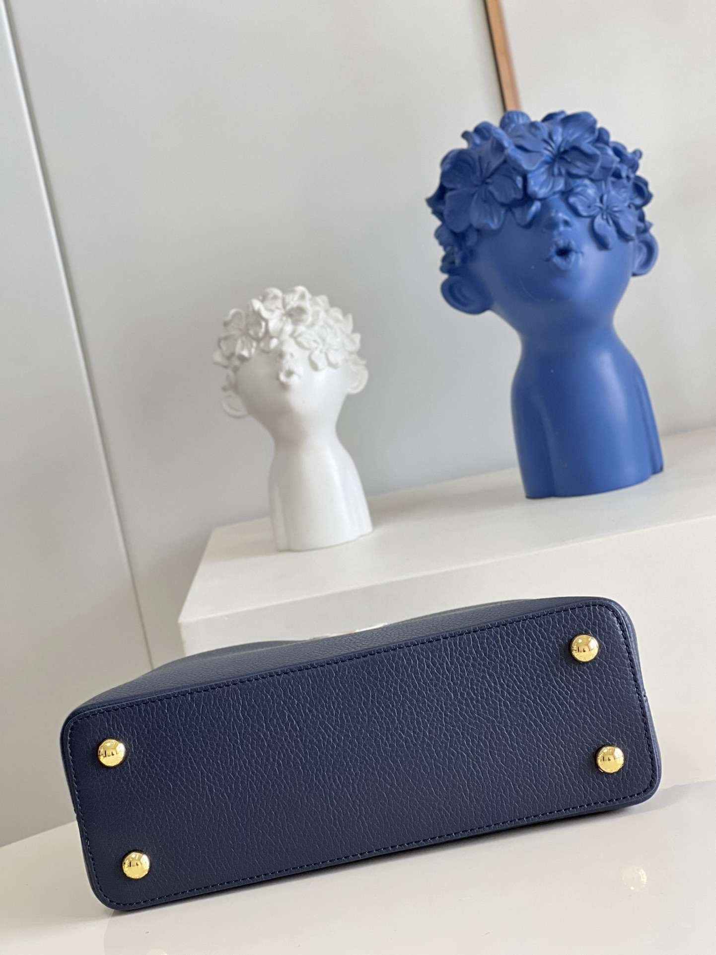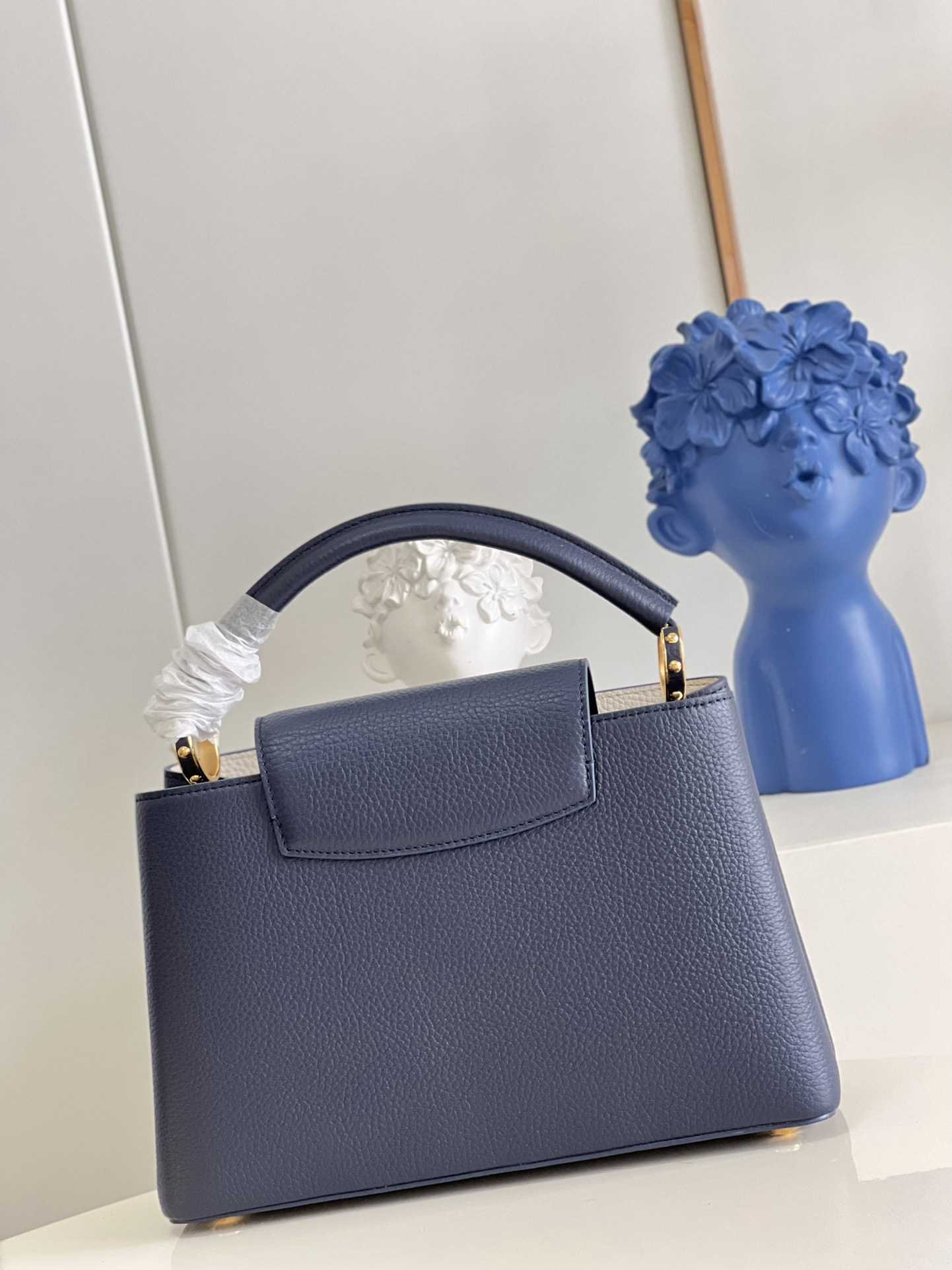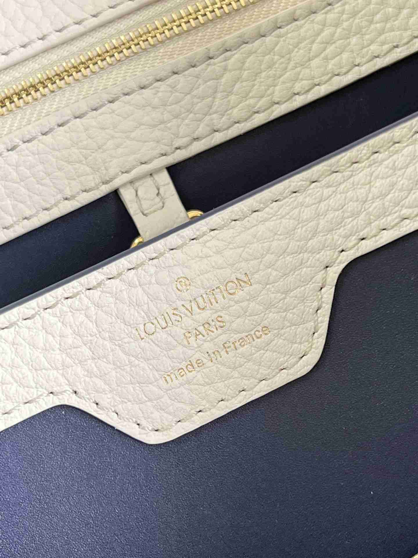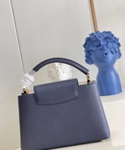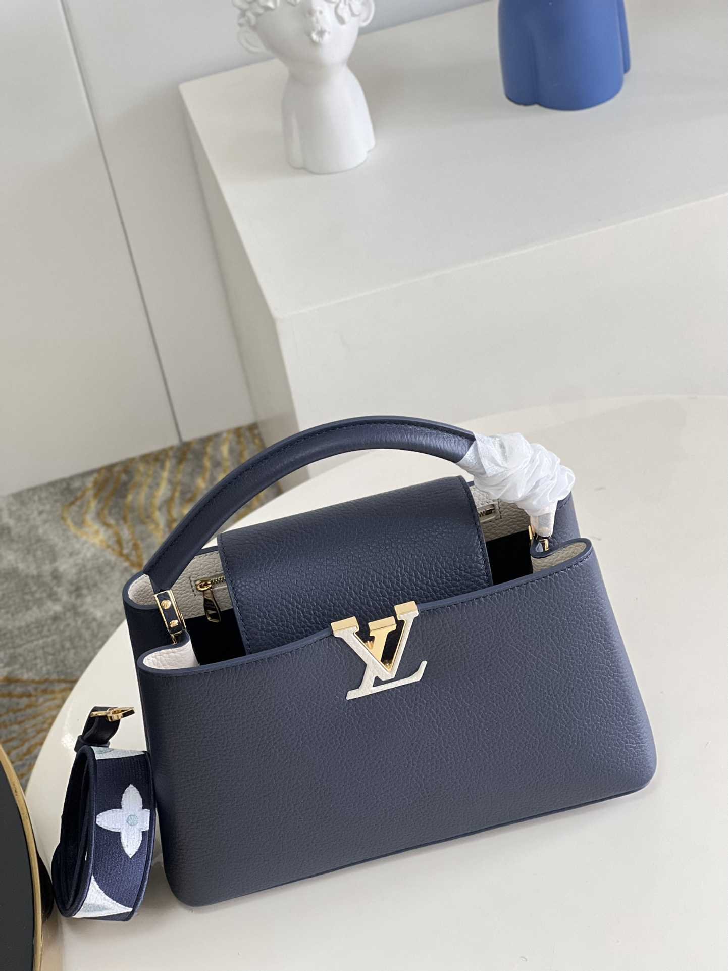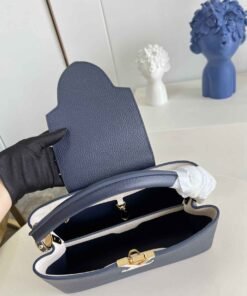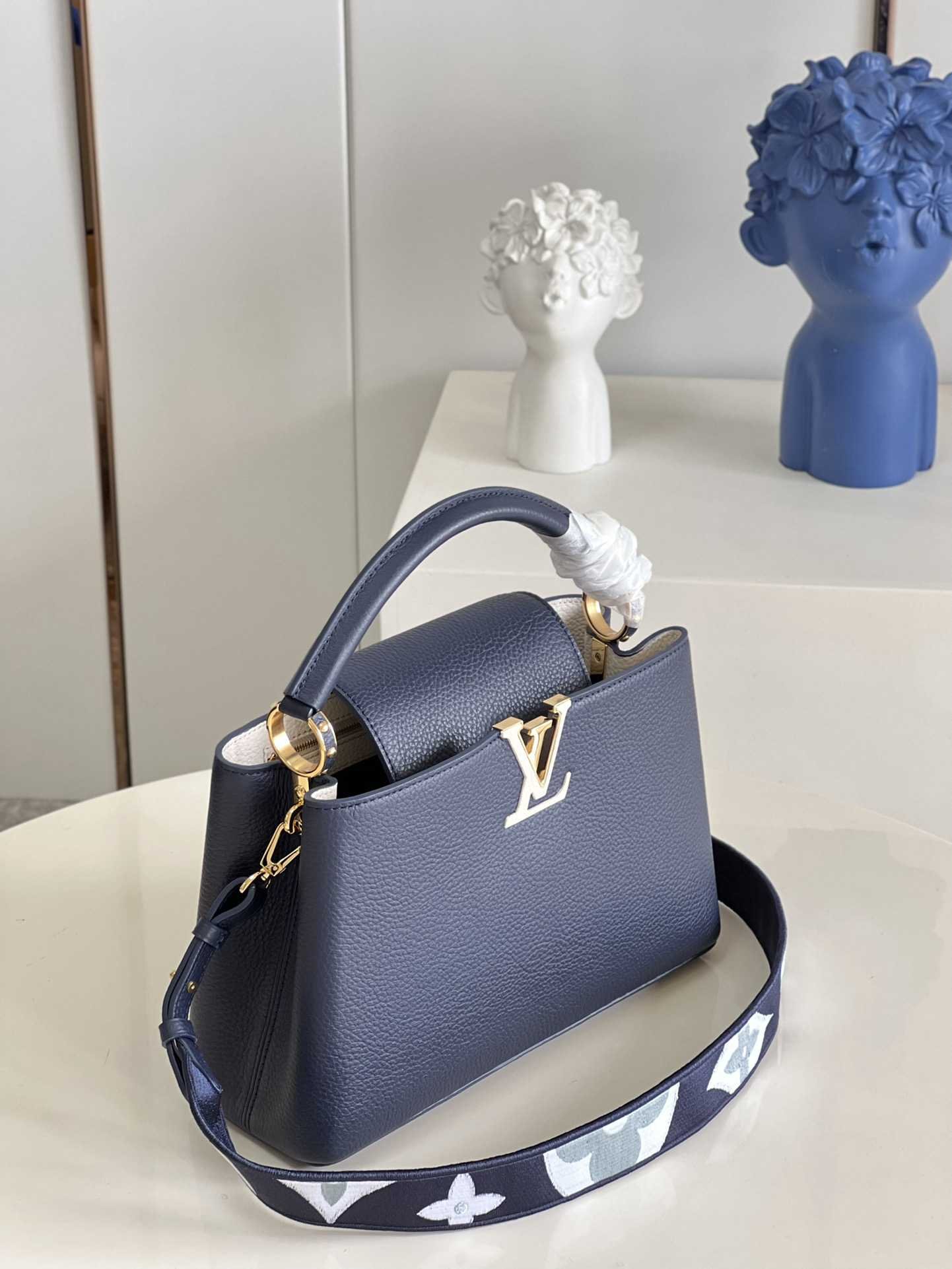 顶级原单【独家实拍 型号M59438海军蓝 中号】 Capucines MM手袋 法国进口小牛皮闪亮的金属饰件特有的Capucines搭盖既可收入包内展示字母标识又可外翻 呈现Monogram Flower图案 size:31.5 x 20 x 11cm