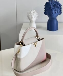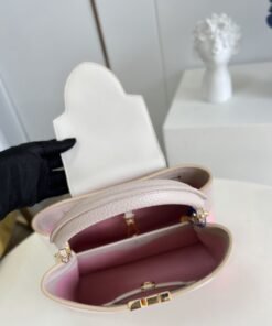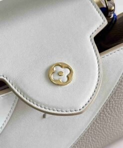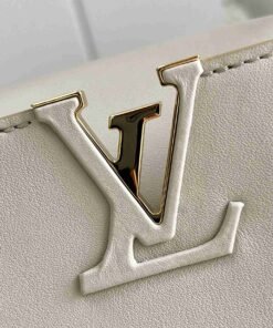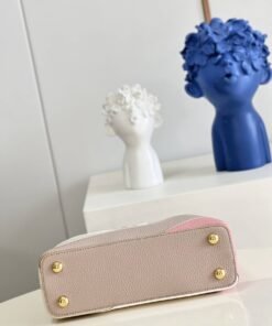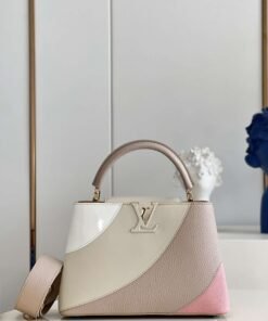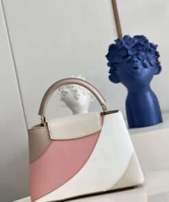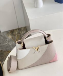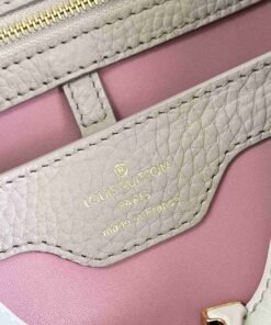 顶级原单【独家实拍 型号M59863灰紫三拼 小号】 Capucines BB手袋 法国进口小牛皮闪亮的金属饰件特有的Capucines搭盖既可收入包内展示字母标识又可外翻 呈现Monogram Flower图案 size:27 x 18 x 9cm